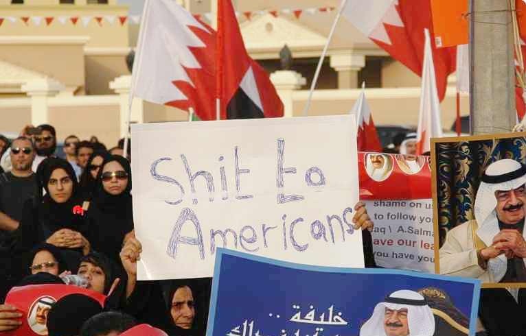 مرآة البحرين (خاص): هل سيرفع الموالون للنظام البحريني شعار "الموت لأمريكا"؟ تبدو الصورة مربكة بالنسبة لمتابعي الحدث المحلي، فالنظام البحريني الذي يستضيف القاعدة العسكرية الأمريكية، ويعلن ملكه عن علاقات إستراتيجية مع واشنطن؛ يتحدث وزير دفاعه وطاقمه الأمني والسياسي والإعلامي عن مؤامرة أمريكية ضد البحرين، ويدفع مواليه لتنظيم مهرجانات تُشبه تجمعات الطلبة الإيرانيين أيام السفارة الأمريكية إبان الثورة! المعروف أنّ خطاب الرئيس أوباما الشهير بشأن الثورات العربية، والذي تطرّق فيه للاحتجاجات في البحرين، مثّل صدمة لمطبخ القرار "التقليدي"، وهو ما تسبب في اختطاف المطبخ ذات الشمال وذات اليمين.