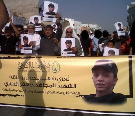 وأِوردت كذلك قول الحكومة البحرينية إن جعفر محمد جعفر الدرازي، الذي كان في الثالثة والعشرين، توفي في الساعات الأولى من صباح اليوم في مجمع طبي كان يعالج فيه الأسبوع الماضي.