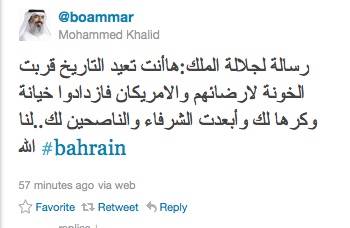 ويعد هذا أقوى خطاب ل"تجمع الوحدة الوطنية" يصدر عن أحد من الشخصيات التي تدير عمليات التفكير بمصيره، بإزاء الإفراجات الأخيرة عن معتقي 14 فبراير/ شباط.بدوره، وجه النائب الإخواني السابق محمد خالد رسالة غاضبة إلى الملك، وصفه فيها بالرغبة في "إرضاء الأميركان". وقال "ها أنت تعيد التاريخ، قربت الخونة لإرضائهم والأميركان فازدادوا خيانة وكرها لك وأبعدت الشرفاء والناصحين لك".