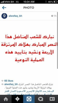ونشرت الجهة المجهولة صورة مساء يوم أمس الاثنين كتب أسفلها عبارة «نبارك للشعب المناضل هذا النصر المبارك بهلاك المرتزقة»، في إشارة إلى تفجير الديه، غربي المنامة والذي قتل فيه 3 شرطة. وأضافت الجهة تحت الاسم التالي (alwefaq_bh)، زاعمة أنه حساب «الوفاق» الجديد بعد إغلاق حسابها الرسمي «نشيد بتأييد هذه العملية النوعية».