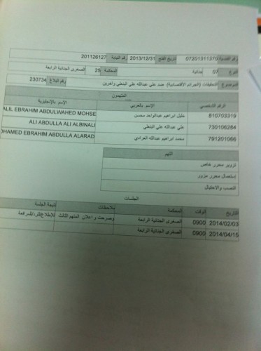 هذا وقد أمرت المحكمة الصغرى الجنائية التي انعقدت أولى جلساتها في 3 فبراير/ شباط 2014، بتأجيل القضيّة إلى جلسة أخرى من المقرر أن تنعقد الشهر المقبل في 15 أبريل/ نيسان، وذلك للاطلاع على الرد والمرافعة.