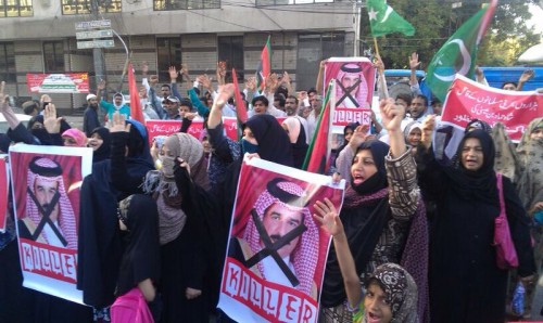 المتظاهرون رفعوا شعارات تعبّر عن غضبهم ﻻستمرار انتهاكات حقوق الإنسان في البحرين والتعاون اﻷمني بين الحكومة الباكستانية والمنامة، ورفعوا صورا للملك البحريني كتب عليها "القاتل"، مشددين على أن التواجد العسكري السعودي هو أحد أسباب تعقيد الأزمة السياسية بالبحرين.