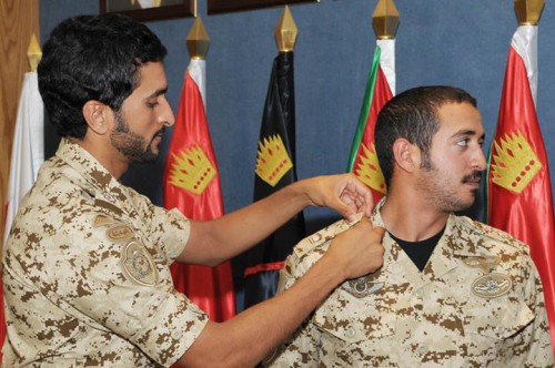 وقد قام أخوه ناصر بن حمد آل خليفة قائد الحرس الملكي بمكتبه صباح اليوم الاثنين 31 مارس/ آذار 2014 بشد الرتبة له.