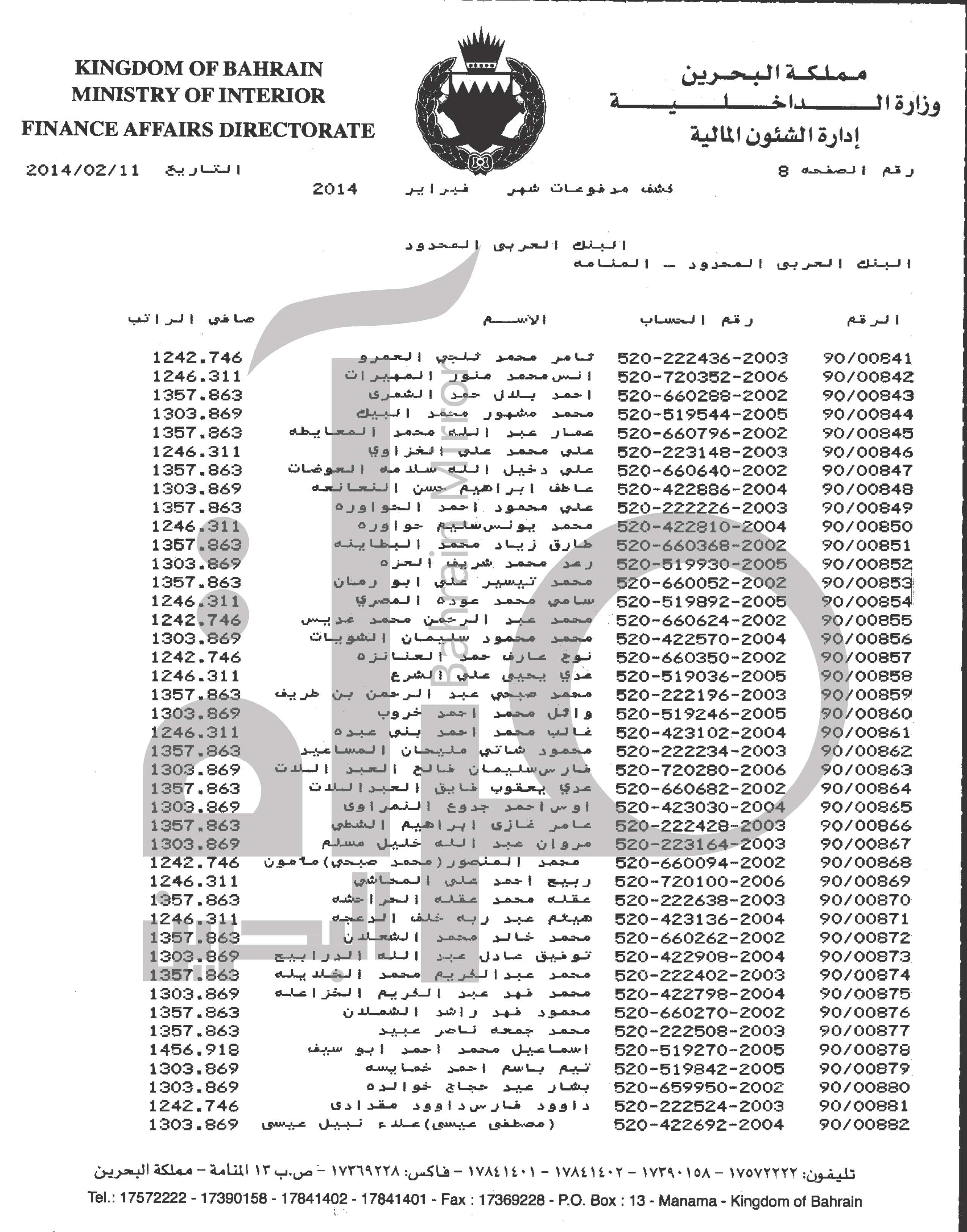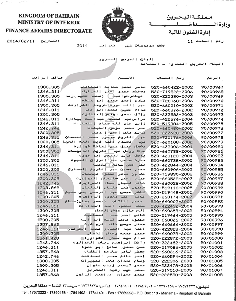 وتظهر الوثائق الصادرة عن وزارة الداخلية البحرينيّة بتاريخ (11 فبراير/ شباط 2014) والتي تنشرها "مرآة البحرين" كاملة، أسماء جميع قوات الدرك المتواجدين في البحرين الذين أظهرت الوثائق أيضاً بأنه تمّ استدماجهم ضمن كادر الوزارة، إضافة إلى الرواتب المخصّصة لهم وأرقام حساباتهم البنكية.