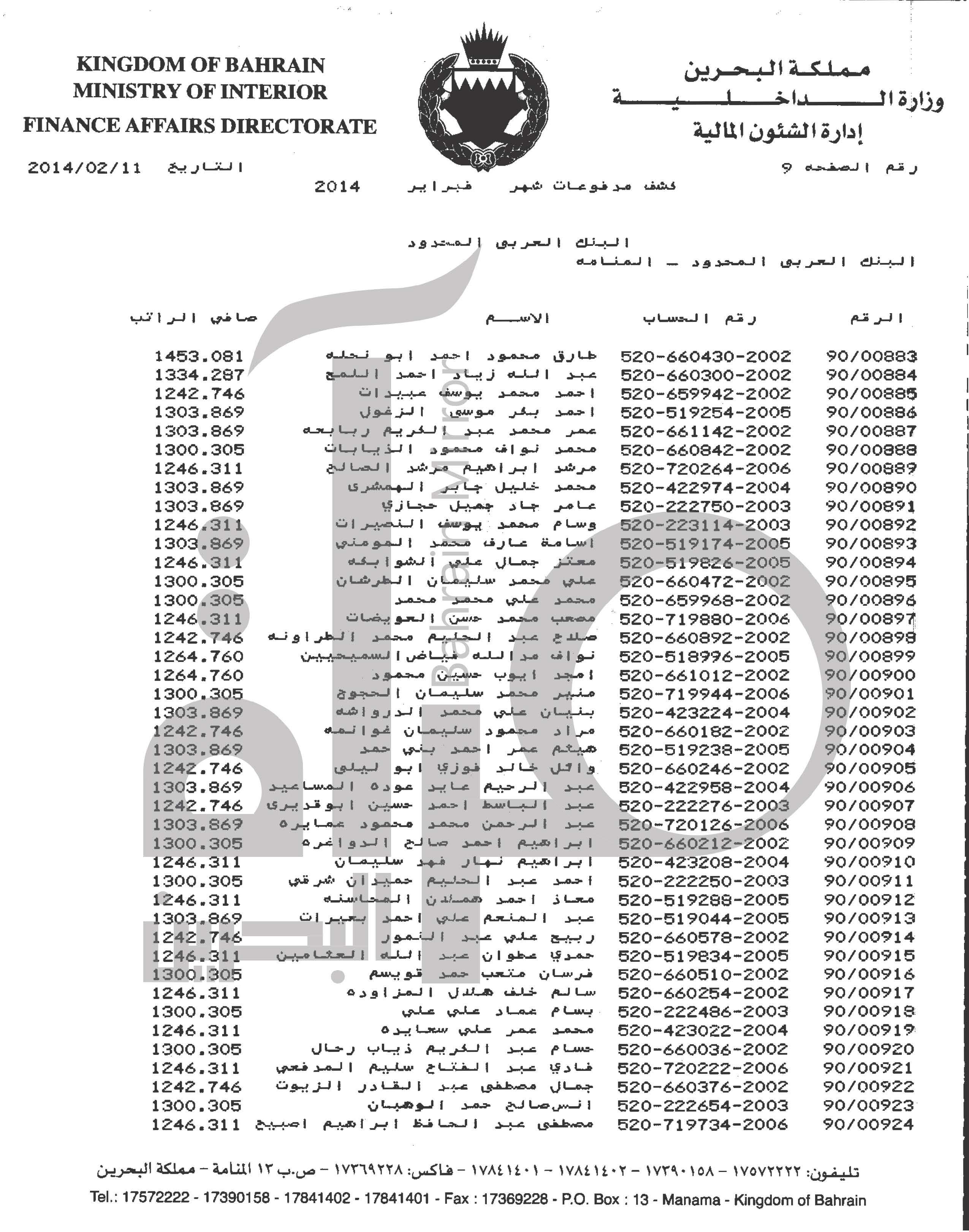 وتقول إحدى الرسائل المؤرخة في 11 فبراير/ شباط 2014 تحت الرقم "اع-ام-4-6-361" بعنوان "مستحقات منسوبي وزارة الداخلية": "تجدون برفقته كشوف مدفوعات البالغة 699.604.073 دينار (ستمائة وتسعة وتسعون ألفاً وستمائة وأربعة دنانير وثلاثة وسبعون فلساً) وذلك عن مدفوعات منسوبي الوزارة لشهر فبراير لعام 2014".