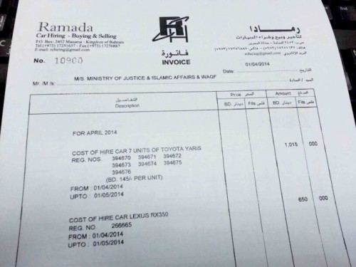 وذكرت الصحيفة ان مستند فاتورة استئجار السيارة يظهر أن بدل إيجار السيارة يبلغ 650 دينارا في الشهر، ونقلت الصحيفة عن مصادر قولها إن قانون الدائرة ولوائحه المالية "لا تنص على تخصيص سيارة أو دفع بدل سيارة لرئاسة الأوقاف"، مشيرة إلى وجود مستندات عبارة عن فاتورة لاستئجار مجموعة من السيارات لدائرة الأوقاف، هي: سيارة "لكزس" من فئة RX 350، و7 سيارات "تويوتا" من نوع "يارس"، يبلغ قيمة إيجارها ألف و15 دينارا شهريا بما يساوي 145 دينارا للسيارة.