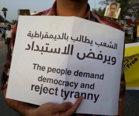 وكتب على ملصق باللغة العربية والانجليزية "الشعب يطالب بالديمقراطية ويرفض الاستبداد". ووقفت الشرطة على مسافة من المسيرة التي انطلقت لمسافة 3.5 كيلومتر على طريق سريغ غربي العاصمة المنامة وانتهت بشكل سلمي.