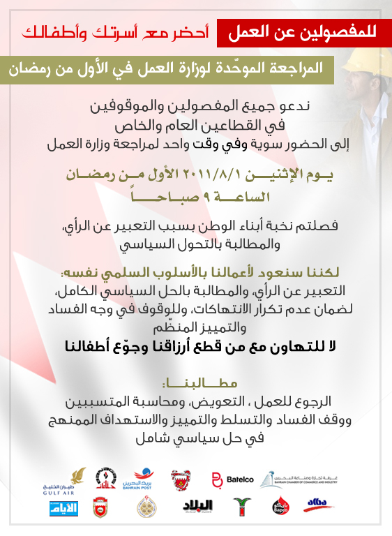 من جهة أخرى، أصدر نخبة من العمال المفصولين بياناً حصلت مرآة البحرين على نسخة منه، دعوا فيه إلى حضور جميع المفصولين (على خلفية سياسية) سوية