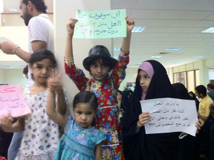 وحيّا القيادي في جمعية الوفاق خليل المرزوق المعتصمين في وزارة العمل، وذلك خلال مؤتمره الصحفي يوم أمس، وفي بيان صدر لاحقاً، وصفت جمعية الوفاق موجات الفصل بأنها عمليات انتقام وقالت إن دعوات العودة للعمل غير مسموعة، واتهمت سياسة الدولة بتعمد تجويع أكثر من 20 ألف مواطن، وأكدت إن ذلك سيخلف كارثة إنسانية، وطالبت الوفاق من المفصولين "الاستمرار في المطالبة بحقوقهم بتحضرهم الكبير الذي يعكس كفاءتهم وإمكانياتهم العلمية والفنية".