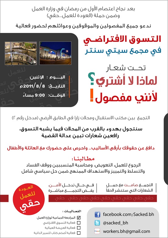 مرآة البحرين (خاص): انتشرت رسائل وتغريدات تدعم حملة (العودة للعمل...حقي) التي يقوم عليها الداعون لاعتصام الأول من رمضان في وزارة العمل، وتناقل المفصولون خبر الفعالية الأولى للحملة، وهي التسوق الافتراضي في مجمع سيتي سنتر.