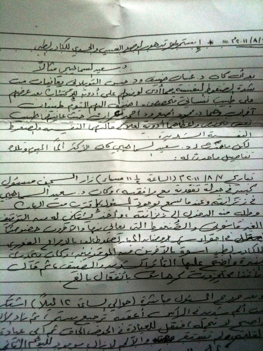 تقول الرسالة "بعد أن كان كل من الطبيبين غسان ضيف وحسن التوبلاني يعانيان من الضغوط النفسية، مما أدى لوصف أدوية مضادة للاكتئاب لهما، وذلك بعد عرضهما على طبيب نفساني متخصص، أضيف إليهما اليوم طبيبين آخرين هما محمد أصغر وأحمد عمران، عاينهما طبيب نفسي متخصص وأعطاهما أدوية لعلاج حالتهما النفسية والضغوط النفسية الشديدة التي يعانيان منه، لكن ما حدث للطبيب سعيد السماهيجي كان الأكثر ألماً اليوم".