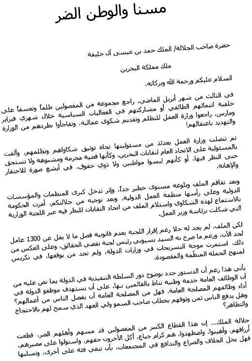 وحذرت العريضة من أن يدخل هذا الحدث التاريخ كأوسع عقاب جماعي من نوع (الفصل عن العمل)، واستغربت أن تتواصل هذه الجريمة على مرأى من الملك وأمامالعالم أجمع، مشيرة إلى استمرار التسريحات في وزارات الدولة، وواصفة ما حصل بالظلم والتجني وسياسة التغلب.