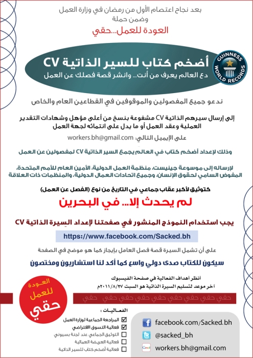 وأكدوا أن الكتاب سيرسل إلى موسوعة جينيس، والأمين العام للأمم المتحدة، ومنظمة العمل الدولية، المفوضة السامية لحقوق الإنسان، وجميع اتحادات العمال الدولية، والمنظمات ذات العلاقة، ودعوا المفصولين والموقوفين وحتى من عادوا إلى أعمالهم إلى إعداد سيرهم الذاتية بحسب النموذج المعد من قبل الحملة والذي يشمل التفاصيل المطلوية لقصة فصلهم عن العمل، كختام لهذه السيرة.