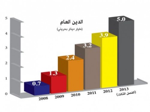مرآة البحرين: كشف الحساب الختامي للدولة للعام 2013 أن الدين العام ارتفع في الربع الثالث من العام بنسبة 32 في المئة، مقارنة مع الفترة نفسها من العام 2012، ليصبح 5 مليارات دينار بحريني.