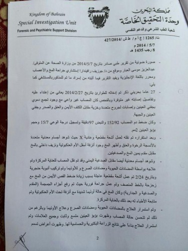 مرآة البحرين (خاص): قال موسى العبّار، والد الشهيد عبد العزيز العبّار، لـ مرآة البحرين" إنهّ استلم ظهر اليوم تقرير النيابة العامة الذي يؤكّد أن سبب وفاة ابنه هو "مضاعفات الإصابة بطلق ناري في الوجه والرأس أدت إلى توقف قلبه ووفاته" بحسب ما ورد في نص التقرير الذي تنشره مرآة البحرين.