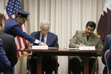 وقع الاتفاق في البنتاجون عن الجانب الأمريكي وزير الدفاع الأمريكي تشاك هاجل ووزير الدفاع القطري حمد بن على العطية.