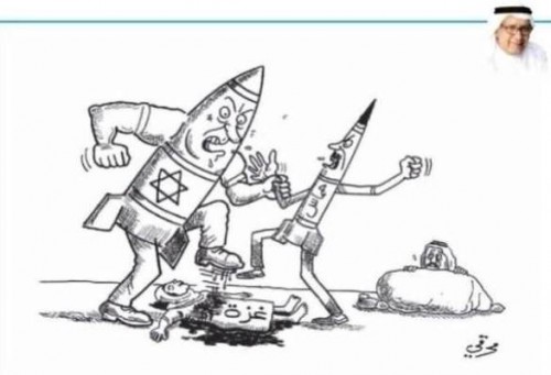 الرسم يظهر صاروخين يتنازعان أحدهما يمثل إسرائيل والآخر مكتوب عليه حماس وتحت أقدامهما جثة طفلة فلسطينية.