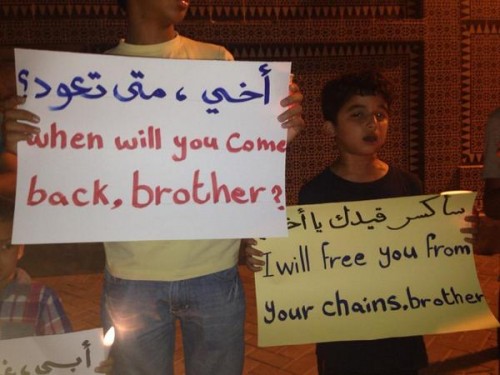 وحمل آخر لافتة كتب عليها غيابك أبي سرق فرحتي! وطفل آخر رفع لافتة (أخي متى تعود؟)، كما شاركت طفلة أحد المعتقلين بكلمة طالبت فيها بالإفراج عن آبائهم وأمهاتهم وإخوانهم المعتقلين.