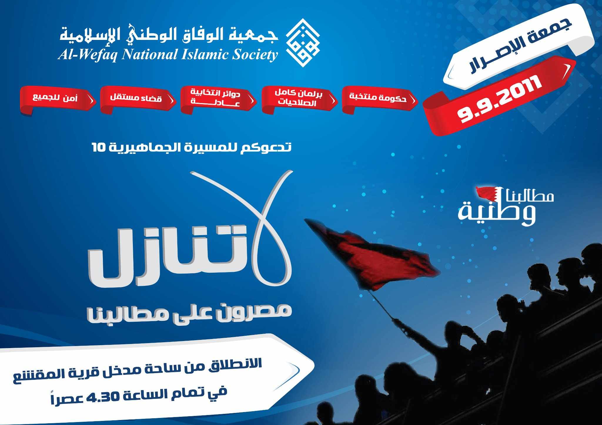 وأعلنت جمعية «الوفاق»عن استمرار فعالياتها الجماهيرية التي ترفع فيها مطالب المواطنين، مشيرة إلى أن فعاليتها المقبلة ستكون عصر يوم الجمعة المقبل بعنوان «جمعة الإصرار» وشعار المسيرة «لا تنازل».