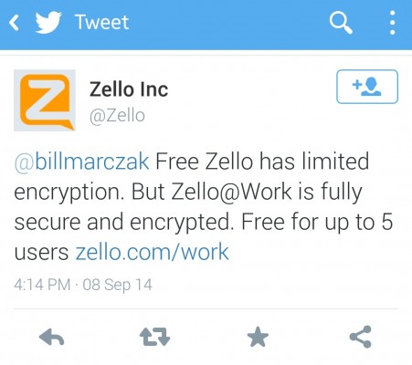 وقالت في رسالة قصيرة عبر حسابها في تويتر وجهتها لعضو المنظمة بيل مارك زاك إن النسخة المجانية من زيلو تشفيرها محدود ولكن النسخة الكاملة آمنة كليا لأنها مشفرة.