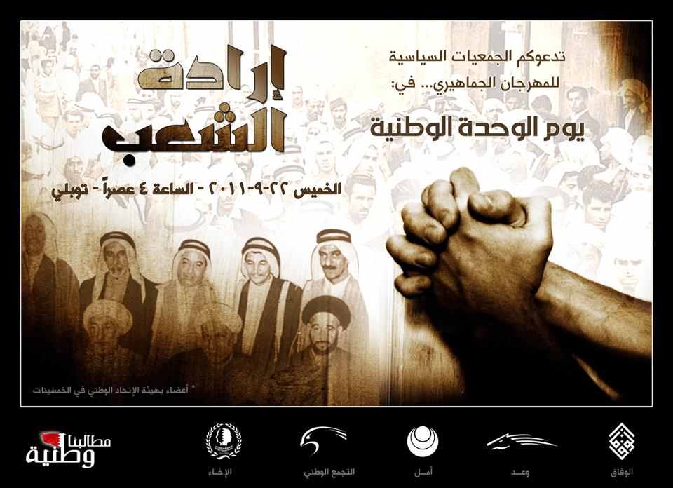 وتعتبر الفعالية المزمع إقامتها الخميس 22/9 الساعة الرابعة عصراً في توبلي أول تجمع شعبي يجمع أطراف المعارضة منذ فرض حالة السلامة الوطنية في مارس\آذار الماضي، حيث تنظم جمعيات "وعد"، "الوفاق" ، "أمل"، "التجمع الوطني" و"الإخاء" مهرجاناً جماهيرياً تحت شعار "إرادة الشعب".