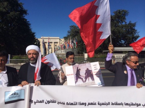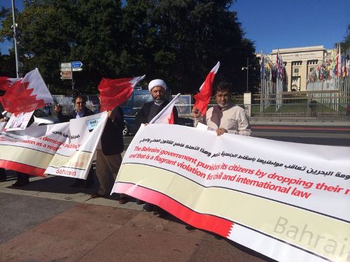 مرآة البحرين (خاص): قام الوفد الأهلي البحريني المتواجد بجنيف مع عدد من أبناء الجاليات العربية والأجنبية بتنفيذ وقفة تضامنية أمام الكرسي المكسور بجوار قصر الأمم المتحدة؛ استنكارا لاستمرار انتهاكات حقوق الإنسان في البحرين، وعدم تنفيذ البحرين لتعهداتها فيما يتعلق بتوصيات بسيوني ومقررات جنيف.