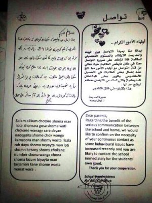 وتحث المطوية التي وزعتها مدرسة أم سلمة الإعدادية للبنات في الحورة شرق المنامة على أهمية التواصل بين أولياء الأمور والمدرسة، وتضمنت لغة الأوردو وهي اللغة التي يستخدمها الباكستانيون.