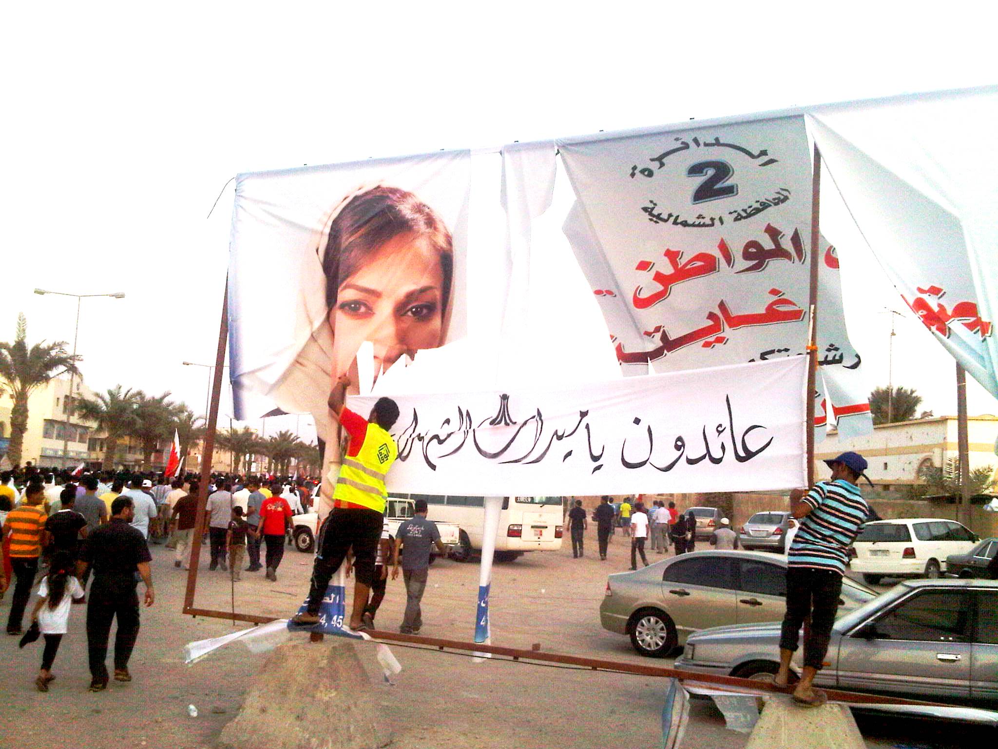 وختم التقرير بالقول "في وقت مبكر الأحد، كتب المتظاهرون رسائل الغضب على خيمة الحملة الخاصة بمرشح مؤيد للحكومة "يسقط حمد" في إشارة إلى الملك حمد بن عيسى آل خليفة".
