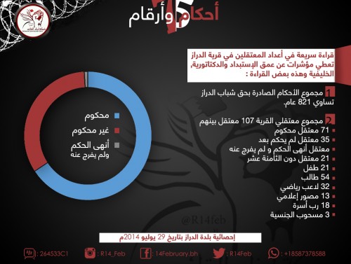 وبلغت مجموع الأحكام الصادرة بحق معتقلي الدراز 821 عاما بحسب الإحصائية.