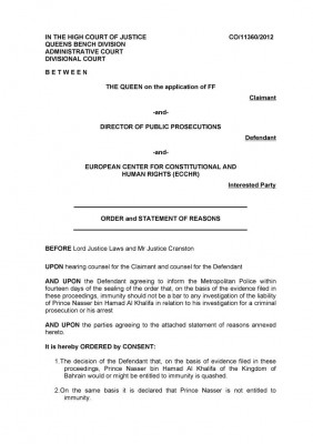 وجاء هذا الاعتراف مكتوبا في حكم المحكمة الذي تنشر مرآة البحرين صورة منه. ونص الحكم على الإعلان الصريح بأن ناصر بن حمد آل خليفة لا يحق له التمتع بالحصانة.
