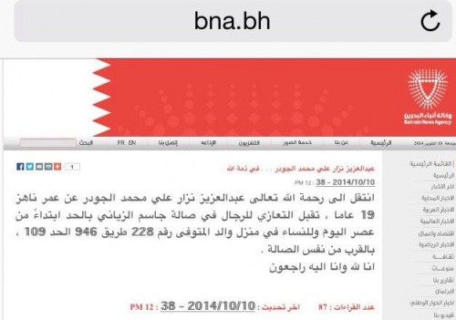 وجاء في نص الإعلان المنشور على موقع الوكالة على "الإنترنت" والتي تمثل منصّة لبث البلاغات الحكومية وإجراءات وأنشطة الدولة "انتقل الى رحمة الله تعالى عبدالعزيز نزار علي محمد الجودر عن عمر ناهز 19 عاما، تقبل التعازي للرجال في صالة جاسم الزياني بالحد ابتداءً من عصر اليوم وللنساء في منزل والد المتوفى رقم 228 طريق 946 الحد 109، بالقرب من نفس الصالة. إنا لله وإنا إليه راجعون".