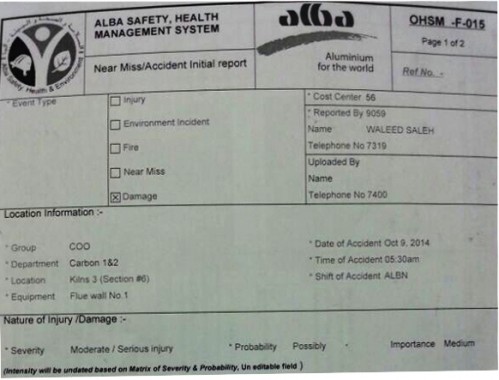 مرآة البحرين (خاص): حصلت "مرآة البحرين" على نسخة من التقرير الخاص بحادث الانفجار الذي وقع في أحد أفران شركة ألمنيوم البحرين "ألبا"، وهو تقرير يثبت كذب إدارة الشركة التي نفت وقوع الحادث، إضافة إلى أن نفي الشركة يثير أسئلة عن سبب الحادث الذي تحاول الشركة التكتم عليه.