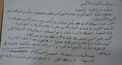 كنت علماً من أعلام أسرتك ووجهاً من وجوه هذا البلد البارزة. الأمل في الله الكريم أن تكون في آخرتك أسعد مما كنت عليه في دنياك".