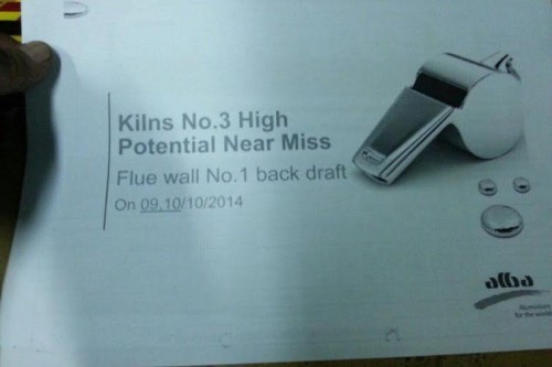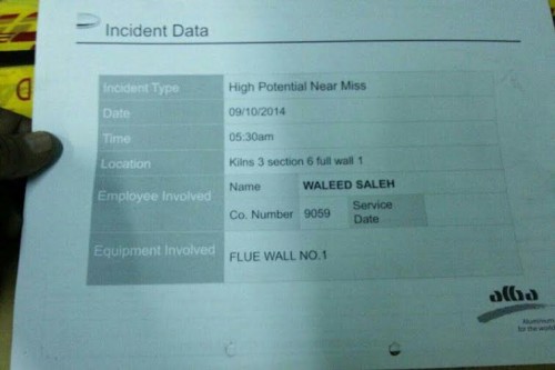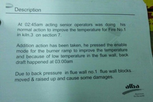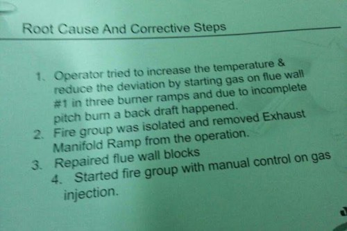 وجاء في وصف الحادثة أن العامل الأول المناوب "كان يقوم بعمله الاعتيادي لتحسين الحرارة في الفرن 3 في القسم 7" ثم أنّه "ضغط على زر التشغيل في الموقد لتحسين الحرارة، وبسبب الحرارة المنخفضة في جدار المداخن، حصل ارتداد اللهب في الساعة 3:00 صباحًا. وبسبب الضغط الارتدادي في جدار المدخنة رقم 1، تحركت لبنات جدار المداخن، وارتفعت، مسببة بعض الأضرار".