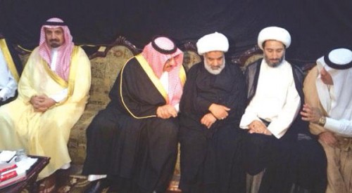 مرآة البحرين: نشرت صحيفة الشرق الأوسط السعودية صورة لوزير الداخلية السعودي محمد بن نايف ومرافقه جلوي بن عبدالعزيز بن مساعد نائب أمير المنطقة الشرقية، مع عدد من رجال الدين الشيعة.