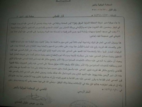 وجاء في الحكم "بناء على أقوال المدعى عليه من مجالسته للشيعة ومواساته لهم والاجتماع معهم وحيث صادق على تغريدته المشار إليها،، وحيث إن ما يقوم به مخالف لتعليمات ولاة الأمر (...) ثبت إدانة المدعى عليه بإثارة الرأي العامومخالفة ولاة الأمر.