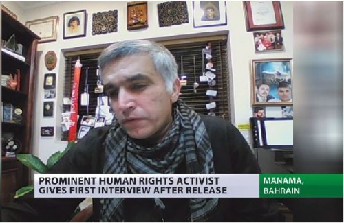في المقابلة الأولى معه بعد إطلاق سراحه من السّجن، صرّح النّاشط في مجال حقوق الإنسان نبيل رجب لموقع روسيا اليوم أنّه سيواصل نضاله في سبيل الديمقراطية. وزجّ رجب في السّجن على خلفية نشره تغريدات على موقع تويتر اعتُبرت مسيئة إلى المؤسّسات البحرينية.