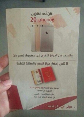 وواصلت السلطات مساعيها في إمكانية إغراء أي شريحة ممكنة من المشاركة في الانتخابات، فقد أعلنت في منشور تم توزيعه في جامعة البحرين عن إقامة مهرجان يوم السبت المقبل 22 نوفمبر/تشرين الثاني (يوم الاقتراع) وعن سحوبات ستشمل 20 هاتفا من نوع آيفون 6، والعديد من الجوائز الأخرى حسب ما هو مذكور.