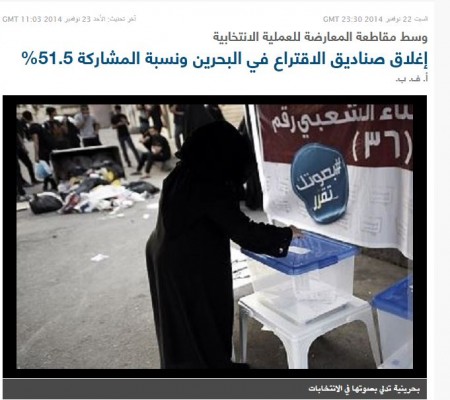 وكتب الموقع أسفل الصورة "بحرينية تدلي بصوتها في الانتخابات"، في حين تظهر في خلفية الصندوق البلاستيكي الصغير لافتة "الاستفتاء الشعبي" وشعاره الذي صيغ بشكل مضاد لشعار الانتخابات الحكومية "بصوتك تقرر".