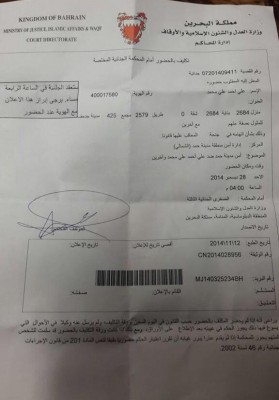 وتلقى الجدحفصي رسالة أمس الاثنين تطلب منه وآخرين المثول أمام المحكمة الصغرى الجنائية الثالثة بتاريخ 28 ديسمبر/ كانون الأول الجاري.