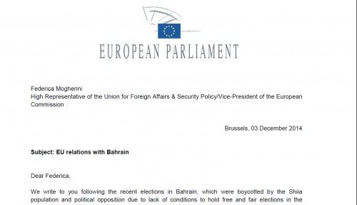 وأبدى الموقعون على الرسالة قلقهم العميق من بيان سفراء الدول الأعضاء في الاتحاد الأوربي في البحرين الصادر بتاريخ 16 أكتوبر/تشرين الأول 2014، والذي يدين المعارضة الديمقراطية الوطنية لمقاطعته الانتخابات، حيث نقل الموقف ذاته من المتحدث باسم هيئة العمل الخارجي الأوروبي (EEAS) في بيانها الصادر بتاريخ 30 نوفمبر/تشرين الثاني 2014.