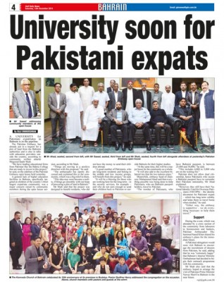 كما كشف المسئول الباكستاني أن «وفدا باكستانيا سيزور البحرين قريبًا لتشجيع توظيف الأطباء الباكستانيين»، وأوضح أن سفارة باكستان تقدمت بطلب للحصول على قطعة أرض من السلطات البحرينية، وأجرت محادثات مع مقدمي التعليم خارج البلاد، وذلك لإقامة جامعة للمغتربين الباكستانيين في البحرين.