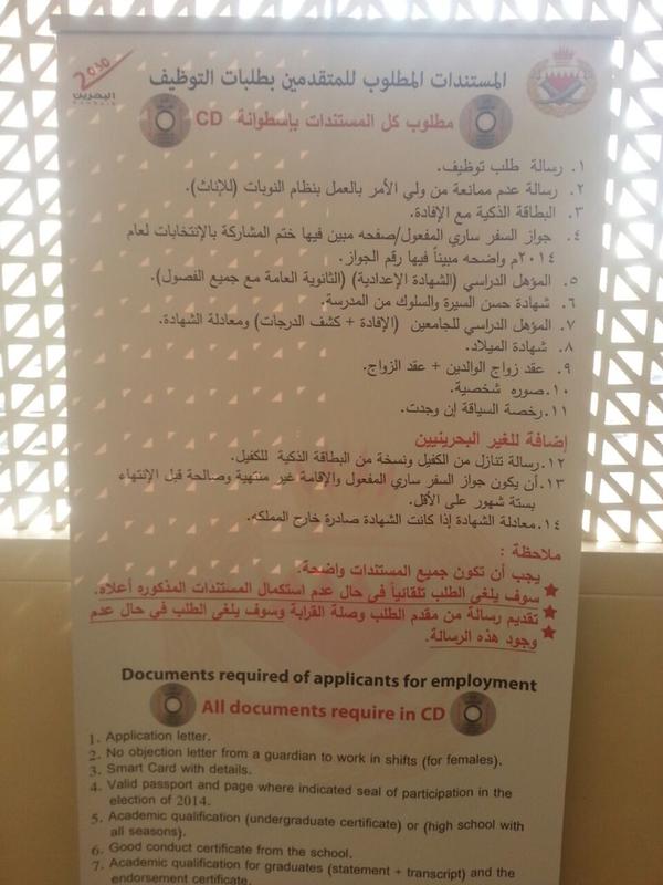 مرآة البحرين (خاص): أظهرت صورة نشرها ناشطون في وسائل التواصل الاجتماعي إعلاناً لوزارة الداخلية البحرينية عن المستندات المطلوبة للتقدم لشغل أي وظيفة في مختلف أجهزتها الأمنية والمدنية.