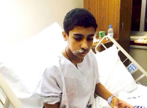 وأوضح بأن ابنه كان يعاني من كسر في الفك، إضافة إلى سقوط 3 من أسنانه، وقال إنه في وضع العناية.
