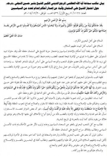المرجع بشير النجفي يأسف لأحكام الإعدام واعتقال أمين عام الوفاق البحرينية المعارضة