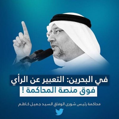 مرآة البحرين (خاص): تنعقد اليوم الثلثاء 13 يناير/كانون الثاني 2015 عند الرابعة عصراً الجلسة الختامية لمحاكمة رئيس شورى الوفاق السيد جميل كاظم، والتي من المنتظر أن تصدر حكماً ضده إثر تغريدة له عبر حسابه الخاص في موقع التواصل الاجتماعي "تويتر" تحدث فيها عن المال السياسي في العملية الانتخابية التي نظمتها السلطات في 22 نوفمبر/تشرين الثاني 2014.