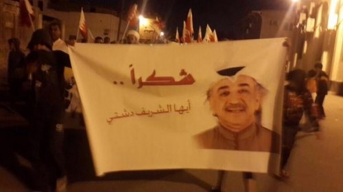 وحمل المتظاهرون لافتات كتب عليها "شكرا أيها الشريف دشتي"، تعبيرا عن الامتنان والتقدير لمواقف المحامي الكويتي، الذي يشغل منصب رئيس "المجلس الدولي لدعم المحاكمة العادلة وحقوق الإنسان في جنيف"، و"الأمين العام لمؤتمر نصرة الشعب البحريني".