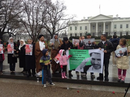 مرآة البحرين (خاص): نظم مركز الهادي في واشنطن وقفة تضامنية مع الأمين العام لجمعية الوفاق الوطني الإسلامية المُعتقل "الشيخ علي سلمان" أمام البيت الأبيض، واعتبر السيد حامد الأعرجي رئيس المركز "انتصار الشعب البحريني مسألة حتمية ولا أفق لإرهاب البحرينين عبر القمع والإعتقال وإن هذه السياسات مآلها الفشل"، مضيفاً إن "العراقين والمرجعية الدينية قد أبدت تضامنها مع الشيخ علي سلمان والشعب البحريني وكذلك الجالية الأمريكية العراقية فهي أيضا تعلن عن هذا التضامن عبر هذه الوقفة الرمزية".