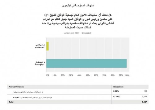 وكان السؤال الذي وجه للمشاركين في الاستبيان هو: هل تعتقد أن استهداف الأمين العام لجمعية "الوفاق" الشيخ علي سلمان ورئيس شورى "الوفاق" السيد جميل كاظم هو إجراء قضائي قانوني بحت أم استهداف مقصود بدوافع سياسية يراد منه إسكات المعارضة، ووضع خيارين هما: هو مجرد عمل قانوني وإجراء قضائي، هو استهداف ذو دوافع سياسية. وقد رأى 3463 من أصل 3567 مشاركاً أن ما يحصل للشيخ علي سلمان والسيد جميل كاظم هو استهداف سياسي يراد منه إسكات المعارضة، بينما رأى 104 مشاركاً أن الأمر لا يتعدى كونه إجراءً قضائياً بحتاً.