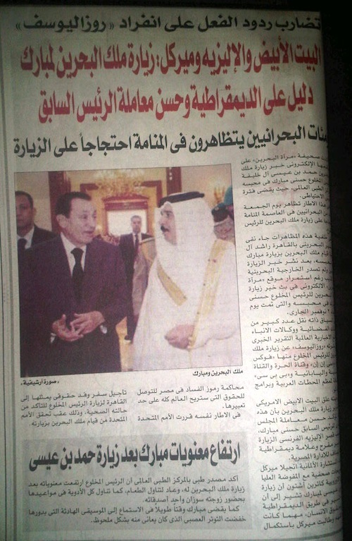 وأكد عدد كبير من المحطات الفضائية ووكالات الأنباء والمواقع الإخبارية العالمية التقرير الخبري الذي نشرته "روزاليوسف" عن زيارة ملك البحرين للرئيس المخلوع منها: "فوكس نيوز" و"سي إن إن" وقناة الحرة والقناة الروسية واليابانية و"بي بي سي، إضافة إلى كثير من المحطات العربية وبرامج التوك شو.